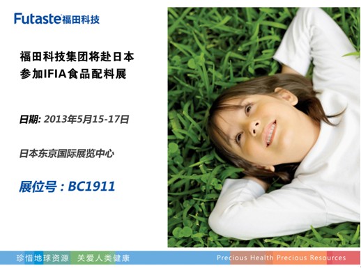 Ifia展是日本最大的食品添加劑和配料及健康食品展覽會(huì),是日本市場(chǎng)最權(quán)威的產(chǎn)品平臺(tái)。日本國(guó)際食品配料、添加劑及健康食品展覽會(huì)(ifia/HFE 2013),將于5月15-17日在日本東京國(guó)際展覽中心舉行,屆時(shí)我集團(tuán)將赴日參展,展位號(hào)為:BC1911,歡迎廣大新老客戶(hù)前來(lái)參觀指導(dǎo)。
