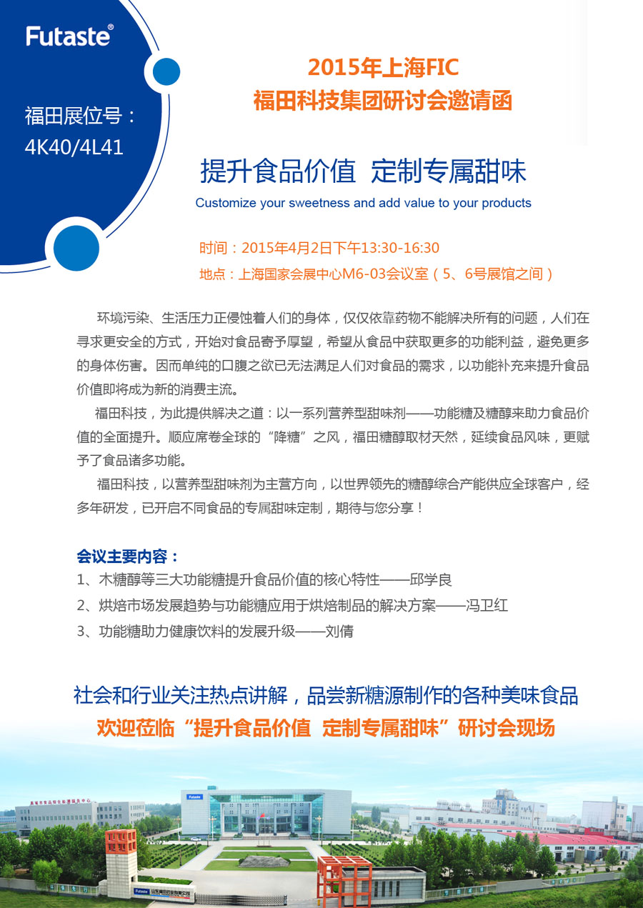 2015上海春季FIC,福田會攜多個領域的成熟復配方案及實例全新亮相,將為新老客戶帶來更多的驚喜,屆時歡迎大家蒞臨指導!