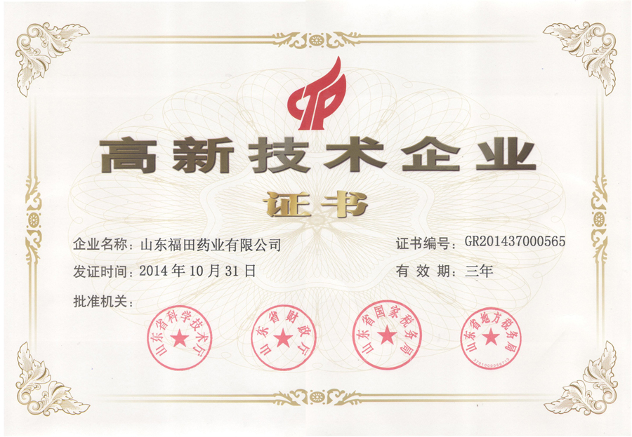 近日,我集團旗下山東福田藥業(yè)有限公司獲得了山東省科學技術廳、山東省財政廳、山東省國家稅務局、山東省地方稅務局聯(lián)合頒發(fā)的高新技術企業(yè)證書。福田藥業(yè)再度被認定為國家高新技術企業(yè),繼續(xù)享受稅收減免等一系列相關優(yōu)惠政策。