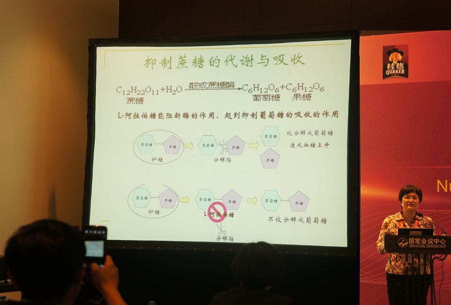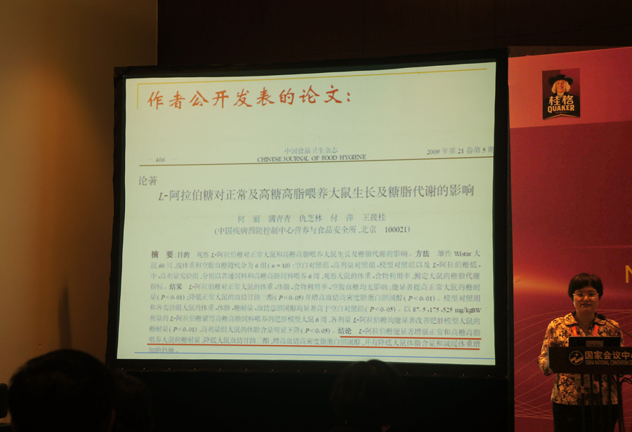 何麗研究員還現(xiàn)場發(fā)布了其2009年發(fā)表于《中國食品衛(wèi)生雜志》上《L-阿拉伯糖對正常及高糖高脂喂養(yǎng)大鼠生長及糖脂代謝的影響》的論著。實驗最終結論:L-阿拉伯糖能顯著增強正常和高糖高脂喂養(yǎng)大鼠的糖耐量,降低大鼠血清甘油三酯,增高血清高密度脂蛋白膽固醇,并有降低大鼠體脂含量和減緩體重增加的趨勢。對L-阿拉伯糖改善糖脂代謝紊亂的功能予以肯定。