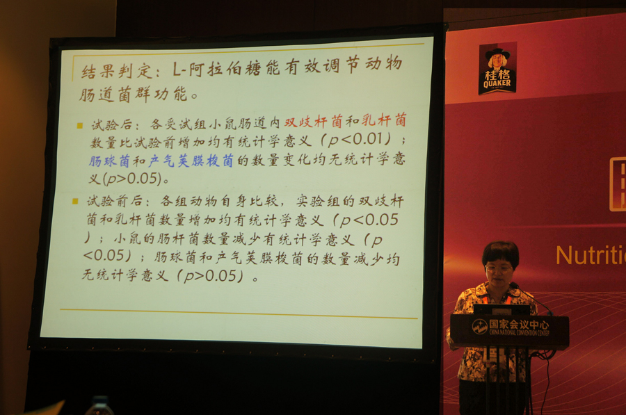 何麗研究員從L-阿拉伯糖的化學結構、生理功能、抑制蔗糖代謝與吸收原理等方面對L-阿拉伯糖進行了介紹,并詳細講解了其所做L-阿拉伯糖調(diào)節(jié)腸道菌群功能動物實驗研究的試驗過程及結果。通過比較實驗前后小鼠自身及組間雙歧桿菌、乳桿菌、腸球菌、腸桿菌和產(chǎn)氣莢膜梭菌的變化情況,結果判定:L-阿拉伯糖能有效調(diào)節(jié)動物腸道菌群功能。