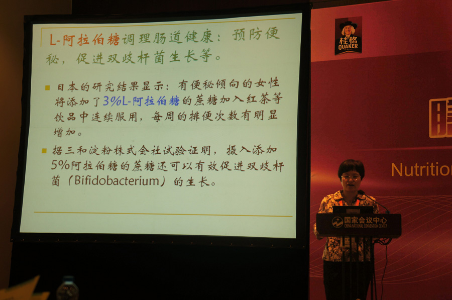 何麗研究員在報告中同時引用了日本對L-阿拉伯糖的研究結果。日本研究結果顯示:有便秘傾向的女性將添加了3%L-阿拉伯糖的蔗糖加入紅茶等飲品中連續(xù)服用,每周的排便次數(shù)有明顯增加。據(jù)三和淀粉株式會社試驗證明,攝入添加5%L-阿拉伯糖的蔗糖還可以有效促進雙歧桿菌的生長。對L-阿拉伯糖調(diào)節(jié)腸道菌群的功能給予充分肯定。