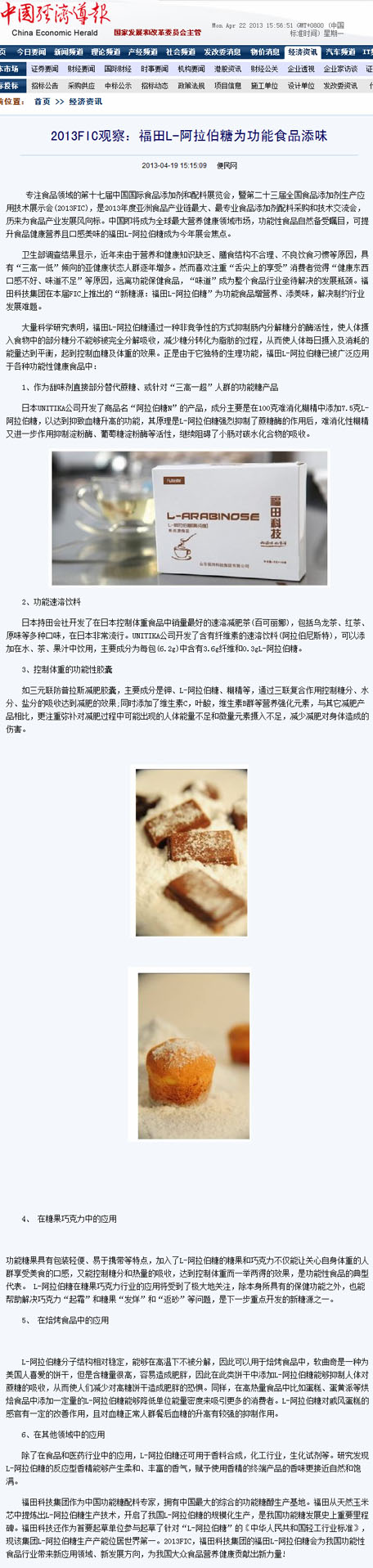 中國經(jīng)濟導(dǎo)報網(wǎng):2013FIC觀察 福田L(fēng)-阿拉伯糖為功能食品添味